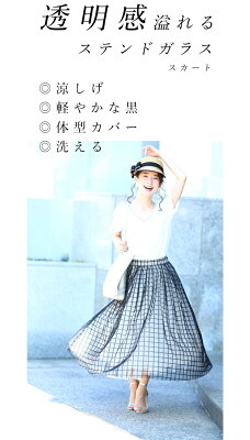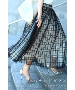 (S~L対応)【再入荷♪8月23日12時&20時より】「FRENCH PAVE」格子チェックのふわり重なるチュールミディアムスカート黒ステンドガラススカート