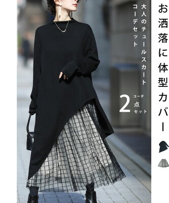 (予約販売:10月15日〜11月15日前後の出荷予定)【コーデセット】「FRENCH PAVE」(M~L対応)(ブラック)お洒落に体型カバー。大人のチュールスカートコーデセットトップス/スカートw68902/w688999月5日20時販売ピックアップ